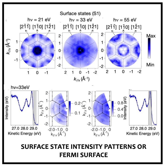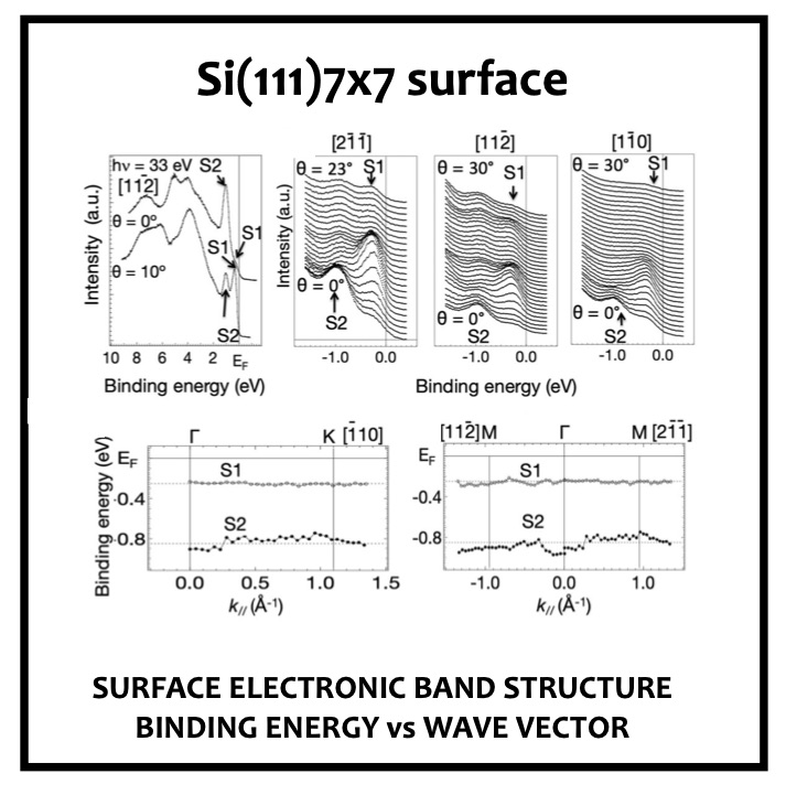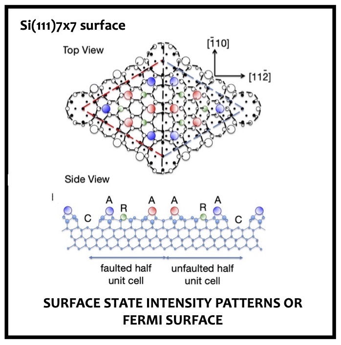Despite extensive investigation of the 2D electronic structure and conductive properties of the surface of Si(111), in its stable (7 × 7) reconstruction, key aspects remain controversial. The surface reconstruction is well- known to lead to the emergence of two surface localised states, generally labelled S1 and S2, in the bulk band gap of Si, at binding energies relative to the Fermi level of ~ 0.2 eV and ~ 0.8 eV, respectively, although there is evidence that the S1 state is split into 2 or 3 distinct components. These states are generally believed to form 2D itinerant band states and have been extensively studied by ARPES. The widely-accepted structural model of the Si(111)(7 × 7) surface reconstruction is the so-called dimer-adatom-stacking fault (DAS) structural model first proposed by Tagayanaki et al. although very recently alternative polymorphs have been proposed. Within this large unit mesh the number of Si dangling bonds produced by cleavage of the bulk crystal is reduced from 49 to 19 by the associated reconstruction of the outermost Si layers, significantly lowering the surface energy. These remaining dangling bonds are on Si adatoms, bonded to three underlying ‘bulk’ Si atoms, and on ‘rest’ atoms in the lower layer that retain their original dangling bond character. Figure 1 shows the DAS structural model, identifying the local geometry of the adatoms and rest atoms. Charge rearrangement is believed to occur with the six rest atoms and the corner hole rest atom, each accepting one electron from an adatom, leaving the 12 adatoms in the outermost layer with only 5 electrons. This odd number of electrons implies that the surface should be metallic.