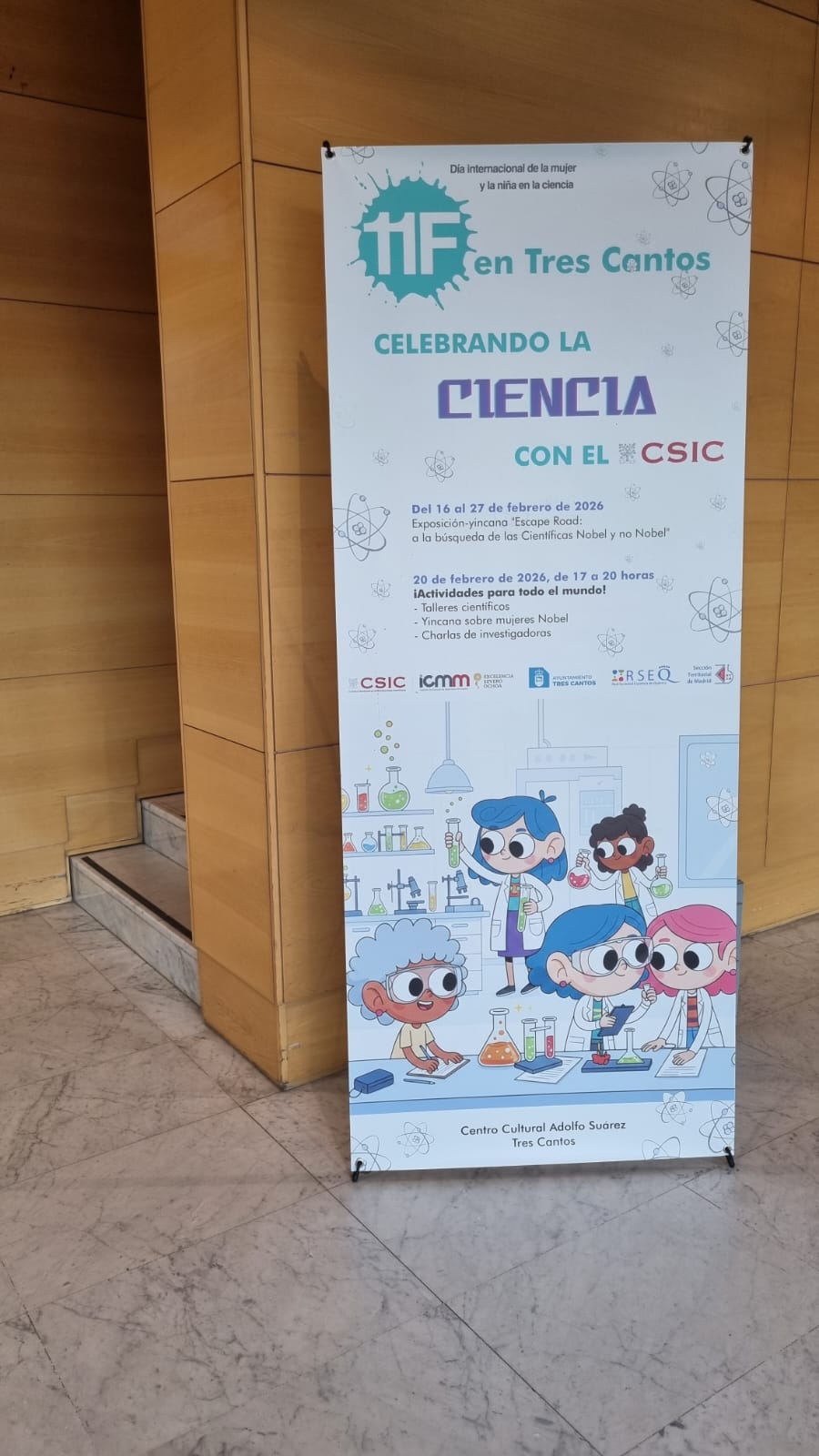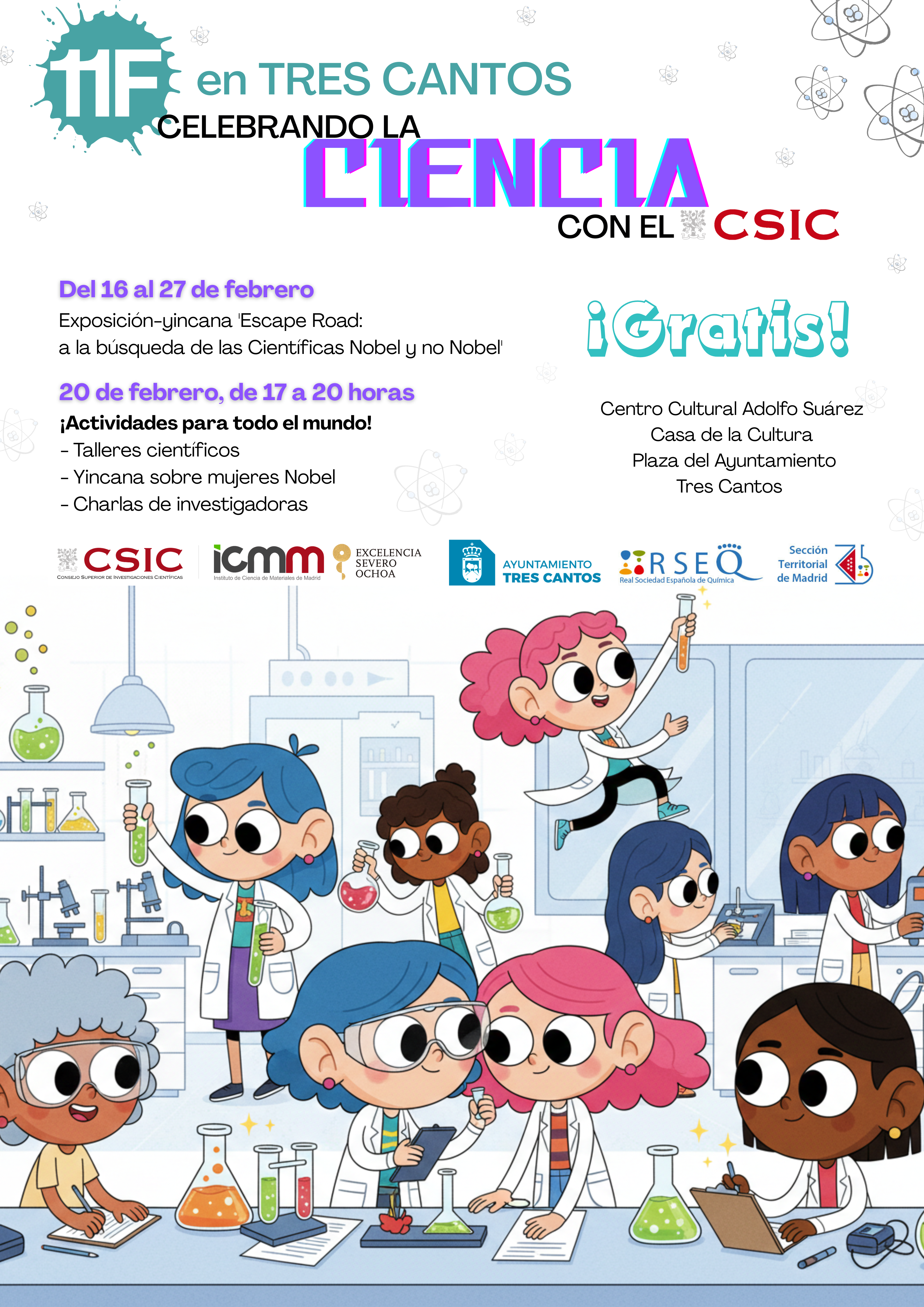 Hemos celebrado la jornada 11F en Tres Cantos: Celebrando la Ciencia con el CSIC, coordinada por Eva M. García-Frutos y Margarita Darder, con talleres científicos, la exposición-yincana «Escape Road: A la búsqueda de las Científicas Nobel y no Nobel» promovida por las Comisiones de Igualdad de los diez centros CSIC del Campus de Cantoblanco, y charlas de seis científicas del ICMM sobre su propia labor investigadora o difundiendo las contribuciones de investigadoras que, con su trabajo, fueron pioneras y sentaron las bases para la ciencia moderna.