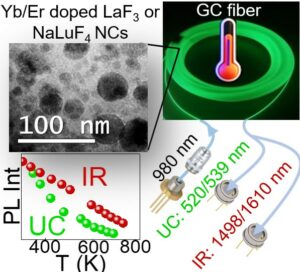Oxyfluoride glass-ceramics (GCs) containing LaF3 or α-NaLuF4 nanocrystals, co-doped with 2 mol% Yb3+ and 0.5 mol% Er3+, are considered as core materials for the implementation of optical fiber photoluminescence (PL) thermometers. A dual-channel ratiometric thermometry approach combining green (UC, 2H11/2 → 4I15/2 vs 4S3/2 → 4I15/2) and infrared emissions (IR, 4I13/2(m´) → 4I15/2 vs 4I13/2(m) → 4I15/2) allows the extension of the sensing temperature range above the UC luminescence quenching (at ≈ 650 K) by over 100 K (LaF3) or 150 K (α-NaLuF4). The IR channel, working near λ= 1.55 mm, operates at the wavelength of minimum propagation losses of optical fibers, facilitating long-distance propagation of luminescence signals. The UC channel in LaF3-GC shows a maximum absolute sensitivity SA = 102 × 10-4 K-1 at 602 K in glass and SA = 71 × 10-4 K-1 at 591 K in GC with thermal resolution δ = 1.5–3 K. The α-NaLuF4-glass and -GC reach UC SA = 90 × 10-4 K-1 at 698 K. The IR channel in both GCs, based on PL intensity ratios at 1498 nm and 1610 nm, exhibits SA ≈ 30-10 × 10-4 K-1 for the 300-800 K range.